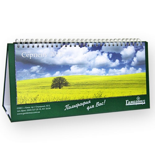 Настільні календарі особливо зручні для використання в офісах, вони не займають багато місця на робочому столі і завжди знаходяться в полі зору власника. Друк настільних календарів можна замовити з перекидним або відривним календарним блоком. Якщо бюджет на друк календарів сильно обмежений, то краще зупинити свій вибір на настільних календарях без блоку. Останнім часом популярними стали настільні календарі, в яких на кожен день відводиться окремий аркуш. Такі календарі зазвичай містять красиві фрази, афоризми, мотивуючі висловлювання. За допомогою таких календарів можна навіть вивчати іноземні мови.