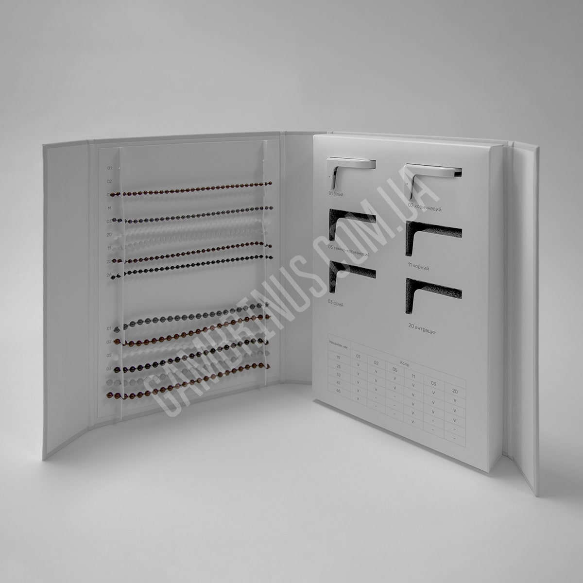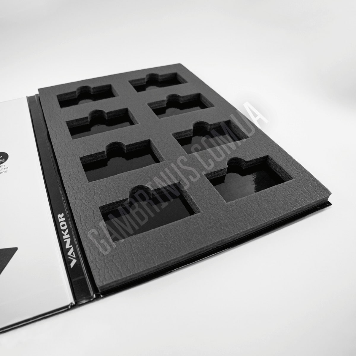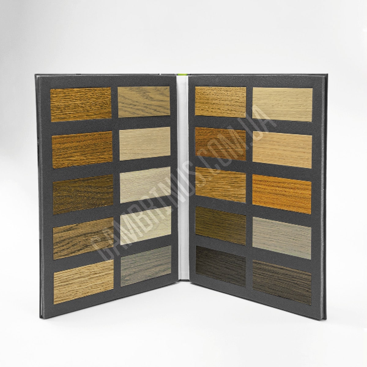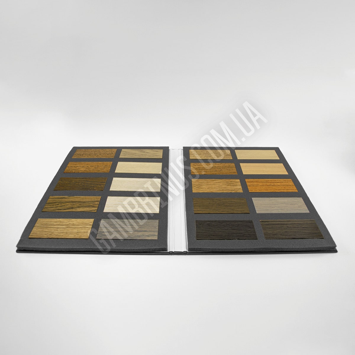 Для багатьох матеріалів варіант приклеювання зразку безпосередньо до папки є неприйнятним. Особливо це стосується об’ємних зразків, які потребують додаткової підтримки та фіксації. Це може бути оздоблювальне каміння, різноманітні профілі та інші будівельні та оздоблювальні матеріали. В таких випадках ми використовуємо ложемент. В якості матеріалу для виробництва ложементу частіше за все виступає ізолон. Ізолон представляє собою пінополіетилен, структура якого складається з ячейок закритого типу і відпрізняється високим рівнем еластичності. В акруші ізолону просікаються “віконця” за розміром і формою підходящі для зразків замовника, часто з виїмкою під палець для зручності вийняття зразку з ложементу. Після цього ложемент з вже висіченими віконцями вклеюють у готову папку та наступає момент вкладання зразків. Вкласти зразки в папки можемо ми, але й замовник, за бажанням, може здійснити це своїми силами. Плюс такої конструкції папки для зразків будівельних та оздоблювальних матеріалів в тому, що, за необхідності, зразок можна вийняти з папки. Є й інша особливість. При виборі такої конструкції папки з використанням ложементу зразки, зазвичай, не маркерують взагалі, або приклеюють наліпки з маркуванням безпосередньо на зразки, тому що на ізолоні така інформація не друкується.